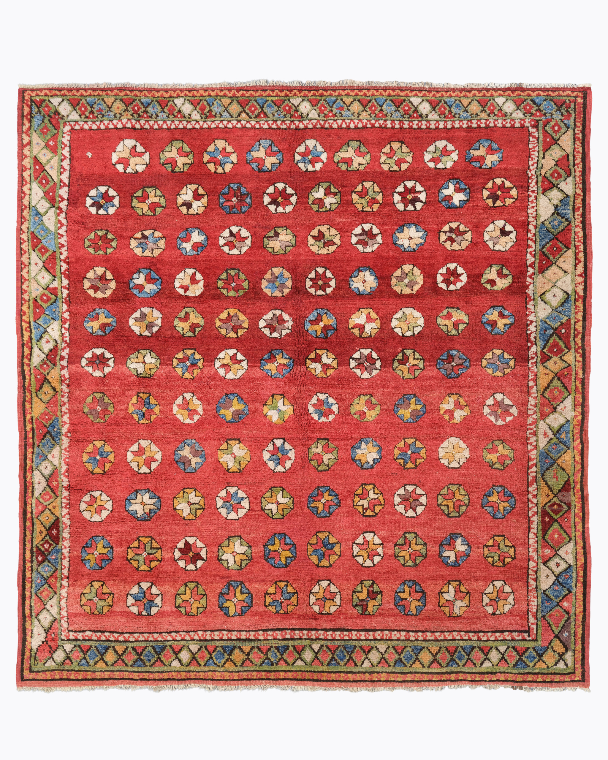 This rare early 19th century Anatolian Cal rug highlights a powerful and rhythmic geometric composition featuring a dense, repeating grid of circular “wheel” or star medallions anchored within a vibrant, saturated madder red field. This structural balance between the minimalist field and the multi colored, graphic medallions reflects the pinnacle of the village weaving tradition in Central Anatolia. Rugs of this antiquity are world renowned for their bold, modern looking aesthetic and their ability to preserve ancient Turkic tribal motifs within a large scale, almost architectural format.