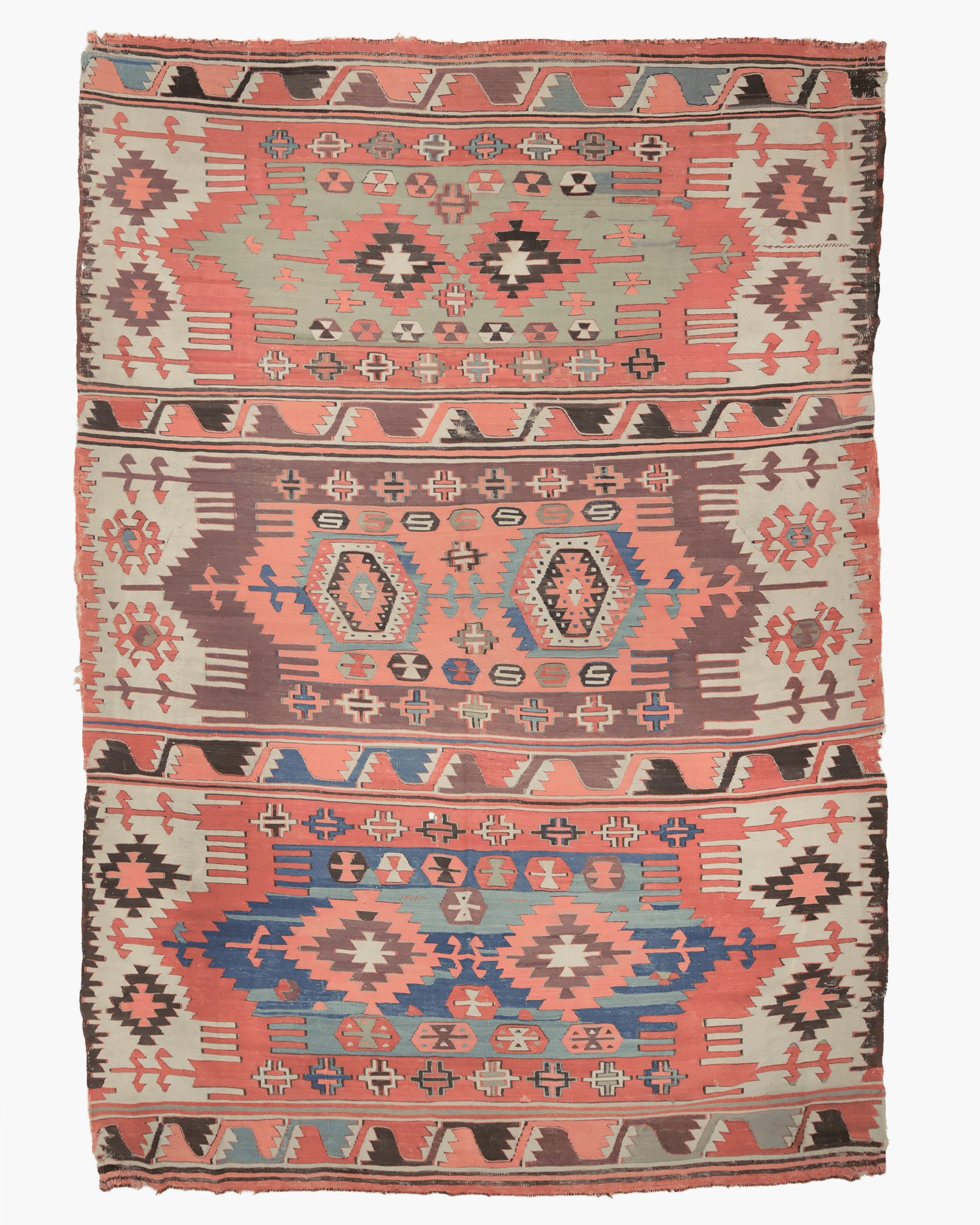 This rare early 19th century Sivrihisar kilim from Central Anatolia is an exceptional example of the archaic tribal weaving traditions and bold geometric language of the region. Sivrihisar weavings are highly esteemed by collectors for their distinctive horizontal composition, large scale motifs, and the use of vibrant natural dyes that create a powerful visual presence.