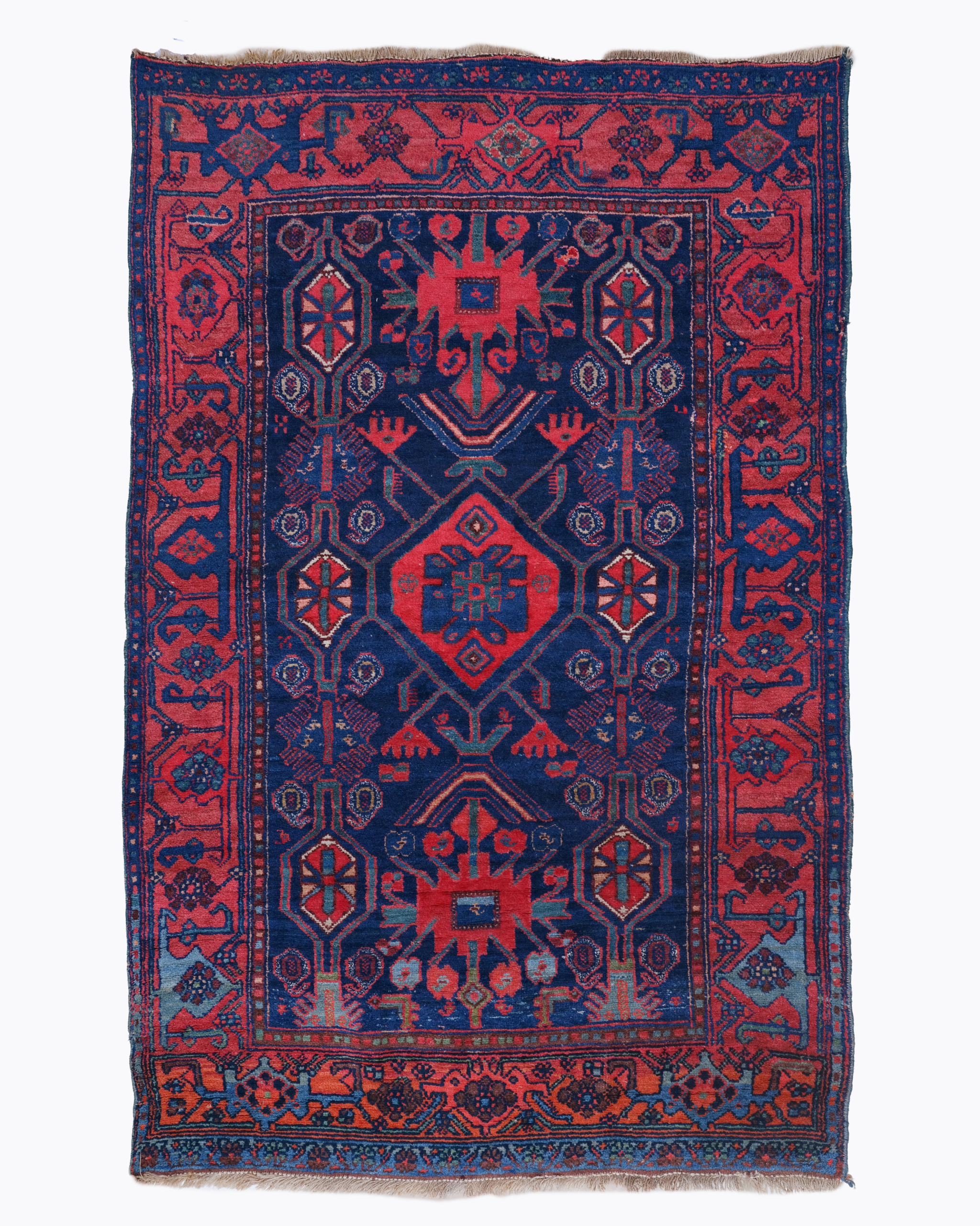 This rare late 19th century Persian Bidjar rug is a striking example of the “Iron Rugs of Persia,” a name earned by the legendary durability and heavy, wet pounded wool construction characteristic of Northwest Persian Kurdish weaving. The composition is dominated by a powerful, triple nested diamond medallion in madder red and sapphire blue, which stands in bold relief against a dense, saturated midnight indigo field. This structural balance between the stepped central medallion and the surrounding geometric floral elements reflects the absolute pinnacle of the Bidjar tradition.