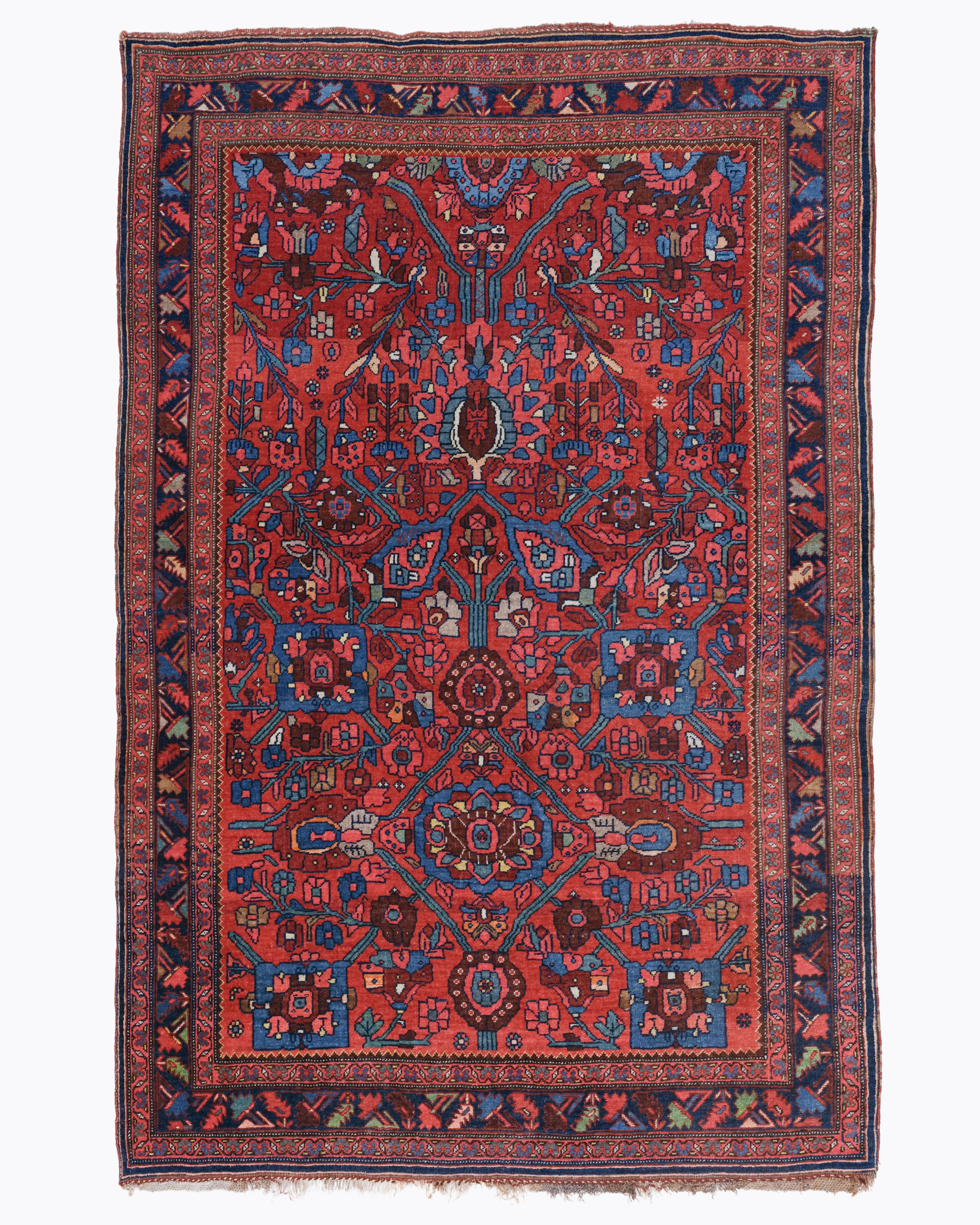 This rare late 19th century Persian Bidjar rug highlights a powerful and rhythmic botanical composition featuring a magnificent stylized Tree of Life motif anchored within a vibrant madder red field. This structural balance between the upward reaching branches heavily laden with blooming palmettes and geometric floral rosettes—and the surrounding midnight indigo borders reflects the pinnacle of the Bidjar weaving tradition. Known as the “Iron Rugs of Persia,” Bidjar productions of this era are highly sought after by collectors for their extraordinary technical durability and their bold, high contrast interpretations of classical Persian garden themes.