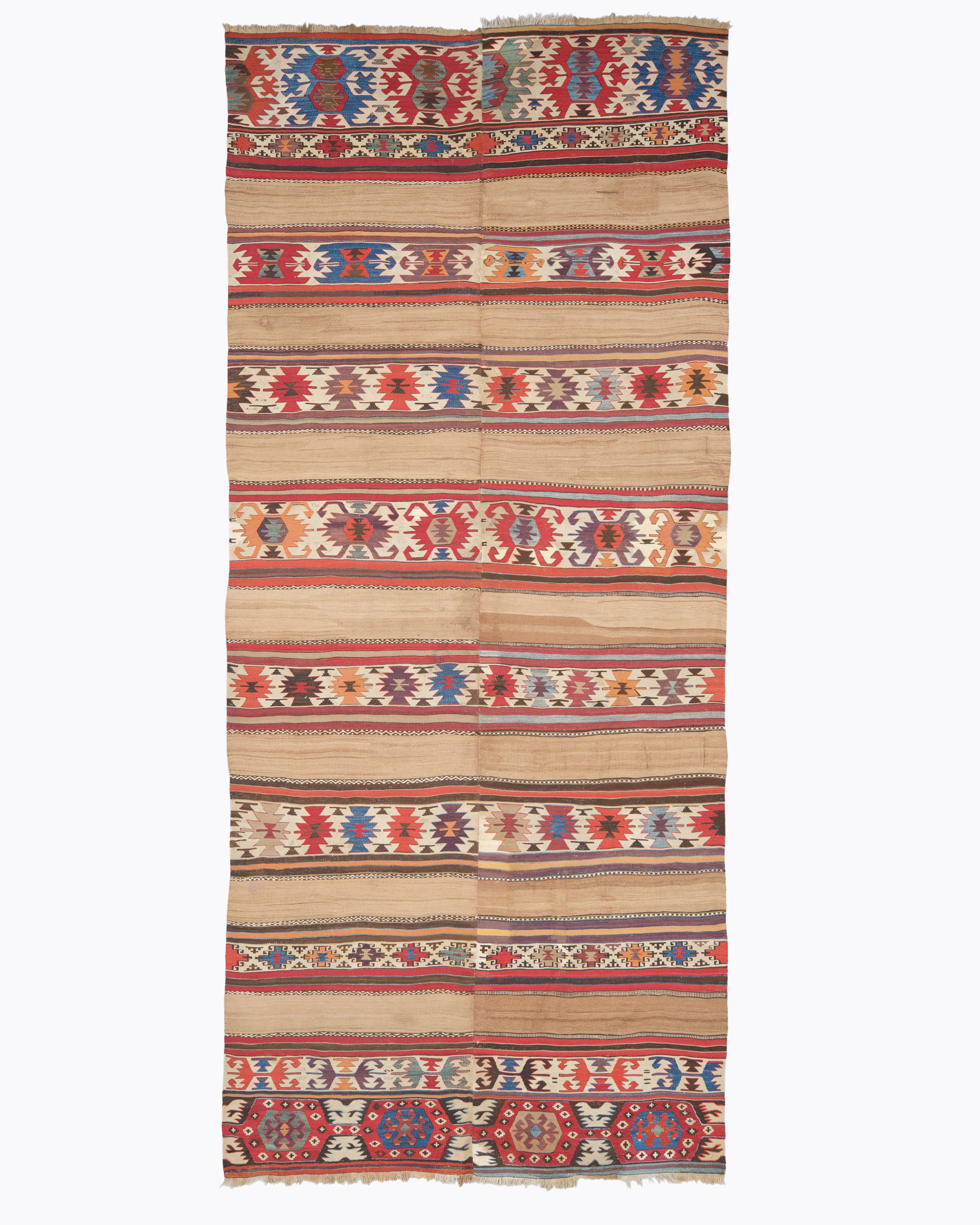 This rare 18th century Cappadocia kilim highlights a powerful and rhythmic tribal composition featuring a series of horizontal decorative bands anchored within an expansive natural camel hair and undyed wool field. This structural balance between the wide minimalist stripes and the precisely woven geometric pattern bands reflects the pinnacle of the Central Anatolian nomadic flatweaving tradition. Textiles of this extreme antiquity and monumental scale are world renowned for their organic aesthetic and their status as essential functional art within the traditional cave dwellings and stone houses of the Cappadocia region.