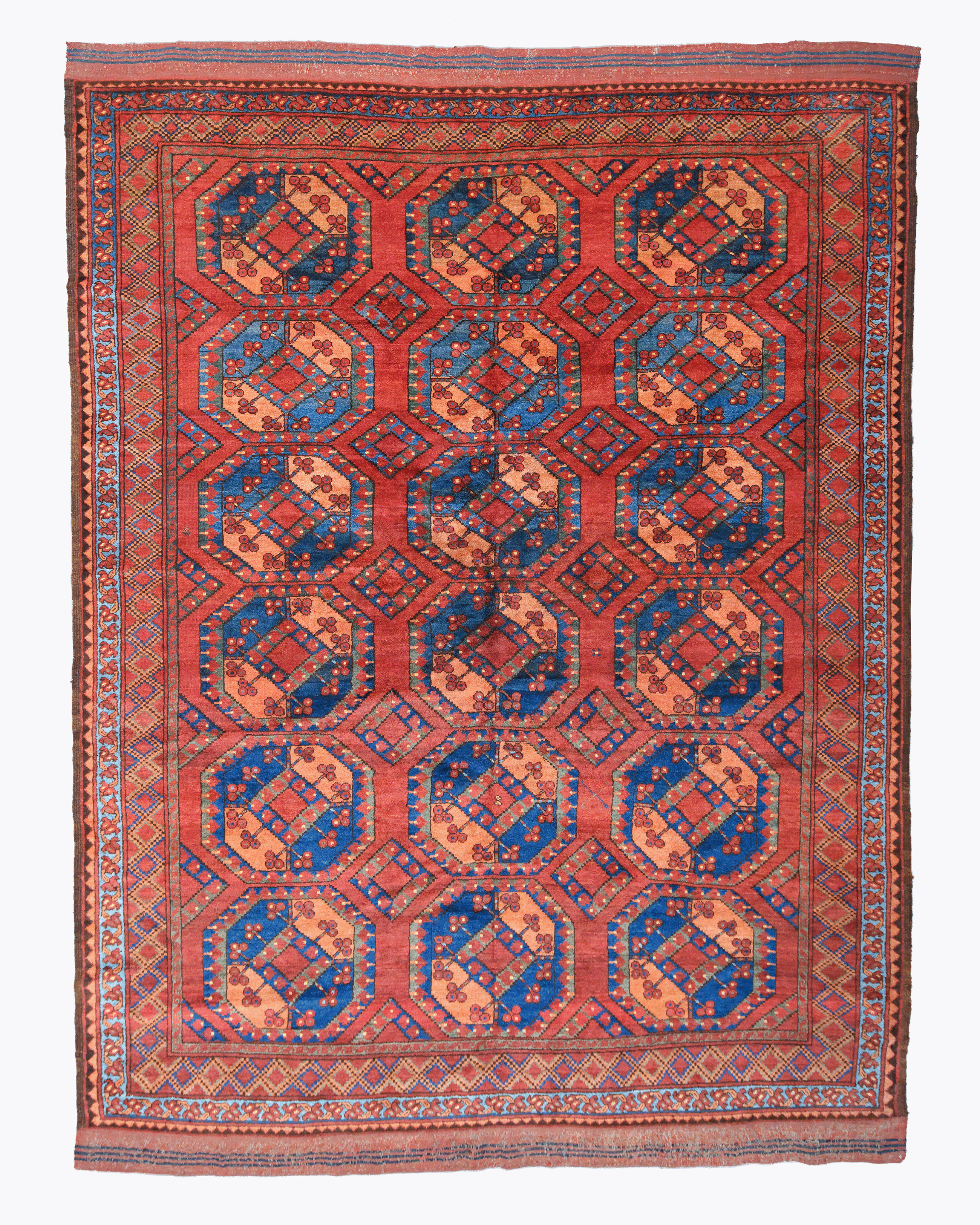 This 19th century Turkmen Ersari main carpet highlights a rhythmic and monumental all over composition, featuring vertically aligned rows of octagonal guls (tribal medallions) rendered in sapphire blue and warm orange against a vibrant madder red field. This structural balance between the repeating, large scale guls and the secondary diamond shaped motifs reflects the specific technical identity of the Ersari tribe, who settled along the Amu Darya river and developed a more expansive, graphic design language compared to the denser patterns of the Tekke or Salor. The design represents a peak in the Middle Amu Darya aesthetic, showcasing the “Gulli Gul” or flower medallion that serves as both a tribal crest and a symbol of fertility.