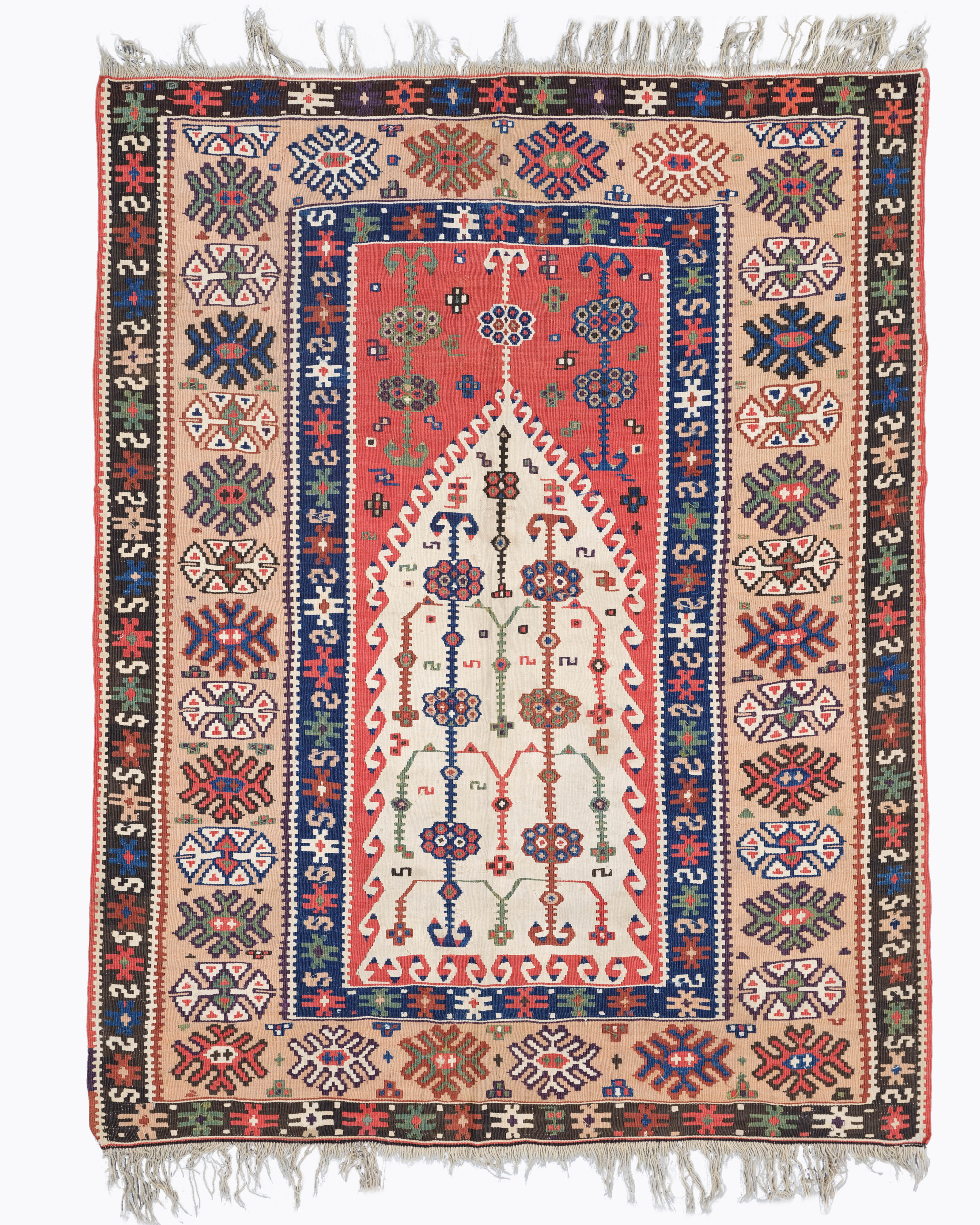 This rare mid 19th century Erzurum prayer kilim highlights a powerful and rhythmic tribal composition featuring a vibrant madder red field decorated with a monumental architectural mihrab anchored within a luminous ivory niche. This structural balance between the expansive primary field and the highly stylized blue and green tree of life motifs reflects the pinnacle of Eastern Anatolian nomadic flatweaving traditions. Textiles of this antiquity are world renowned for their archaic artistic language and their ability to blend formal prayer design with the bold geometric energy of rural weaving groups.