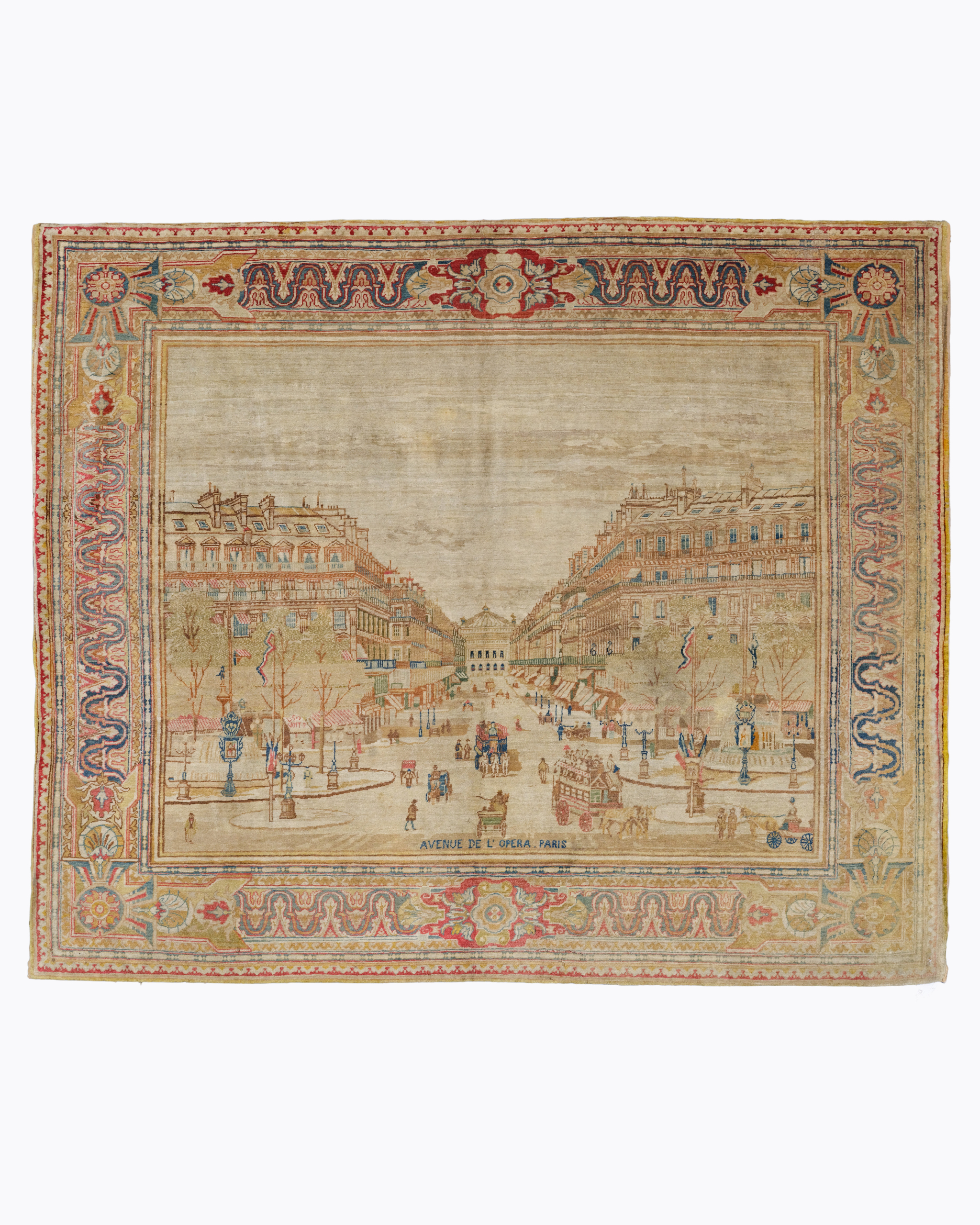 This rare late 19th century Turkish Feshane pictorial rug highlights a powerful and rhythmic architectural composition featuring a masterfully rendered perspective of the “Avenue de l’Opera Paris” anchored within a luminous golden sand field. This structural balance between the detailed Parisian cityscape—complete with horse drawn carriages and grand facades—and the surrounding neoclassical border reflects the pinnacle of the Ottoman Imperial Feshane weaving tradition. Textiles of this era from the Feshane factory are world renowned for their extraordinary technical precision and the use of Western pictorial themes that represent a distinct artistic language developed during the late Ottoman modernization period.