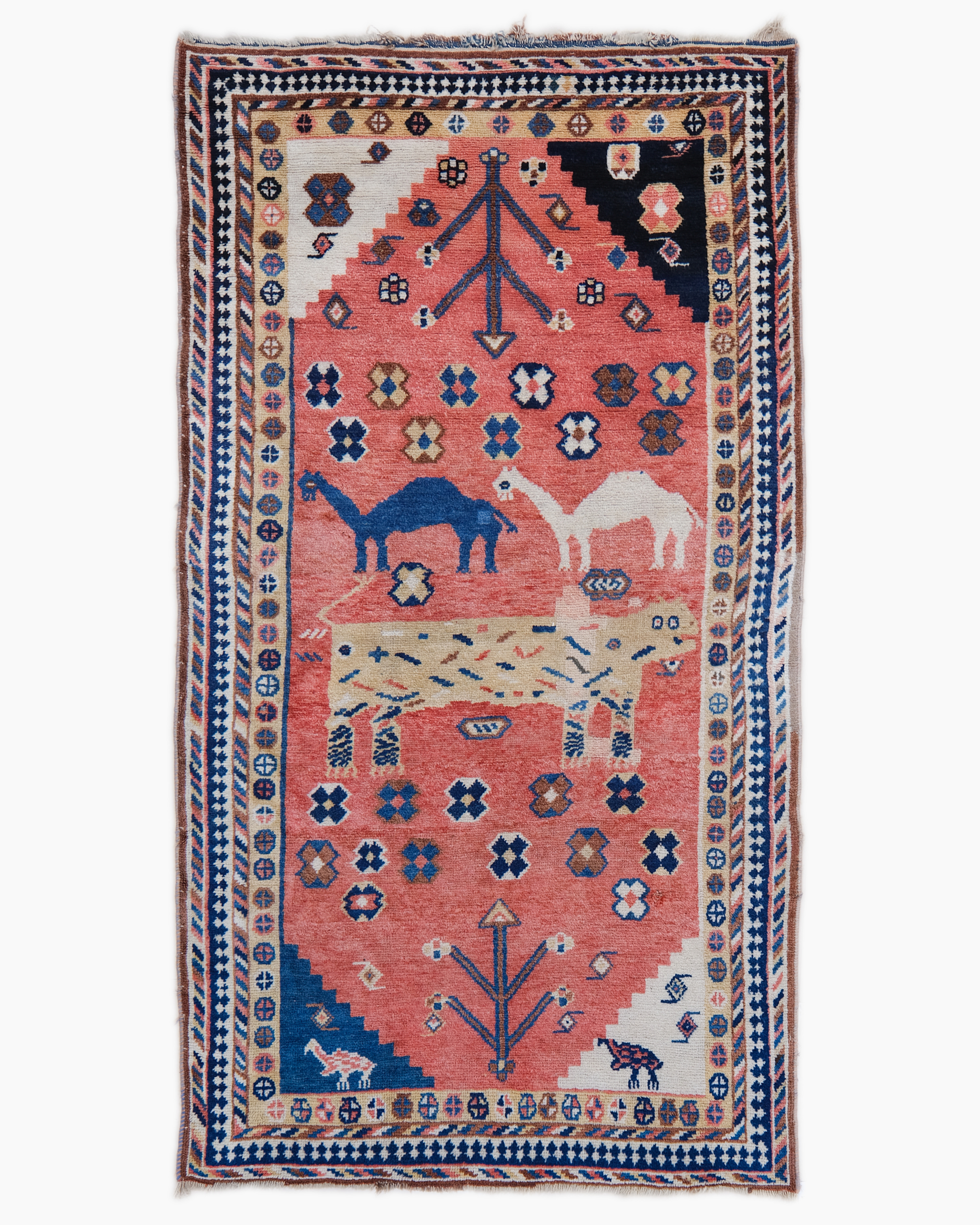 This rare late 19th century Persian Gabbeh rug highlights a powerful and rhythmic zoomorphic composition featuring a monumental, stylized lion or “leopard” figure accompanied by two camels, anchored within a vibrant, saturated coral pink field. This structural balance between the expansive field and the whimsical, large scale animal motifs reflects the pinnacle of the Qashqai or Luri nomadic weaving tradition in Southwest Persia. Rugs of this antiquity are world renowned for their primitive, almost modern art like aesthetic and their spontaneous storytelling, which provides a direct window into the daily life and symbolism of the nomadic tribes.