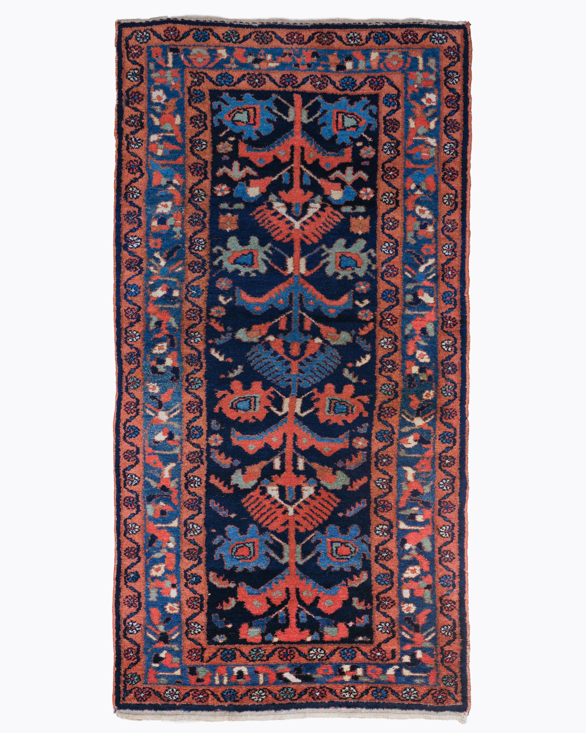 The color palette is masterfully balanced, featuring a primary midnight indigo field that serves as a dramatic canvas for high contrast shifts of madder red, turquoise blue, and camel. These rich and enduring tones, achieved through the expert application of natural dyes over 130 years ago, exhibit a chromatic strength and a saturated depth that are hallmarks of the finest late 19th century Hamadan region productions. The inclusion of a wide, multi layered border system anchored by a terracotta ground primary border decorated with a rhythmic sequence of reciprocating floral rosettes and scrolling “vine” motifs creates a precise visual frame that highlights the superior wool quality and distinctive technical finesse of the weavers.