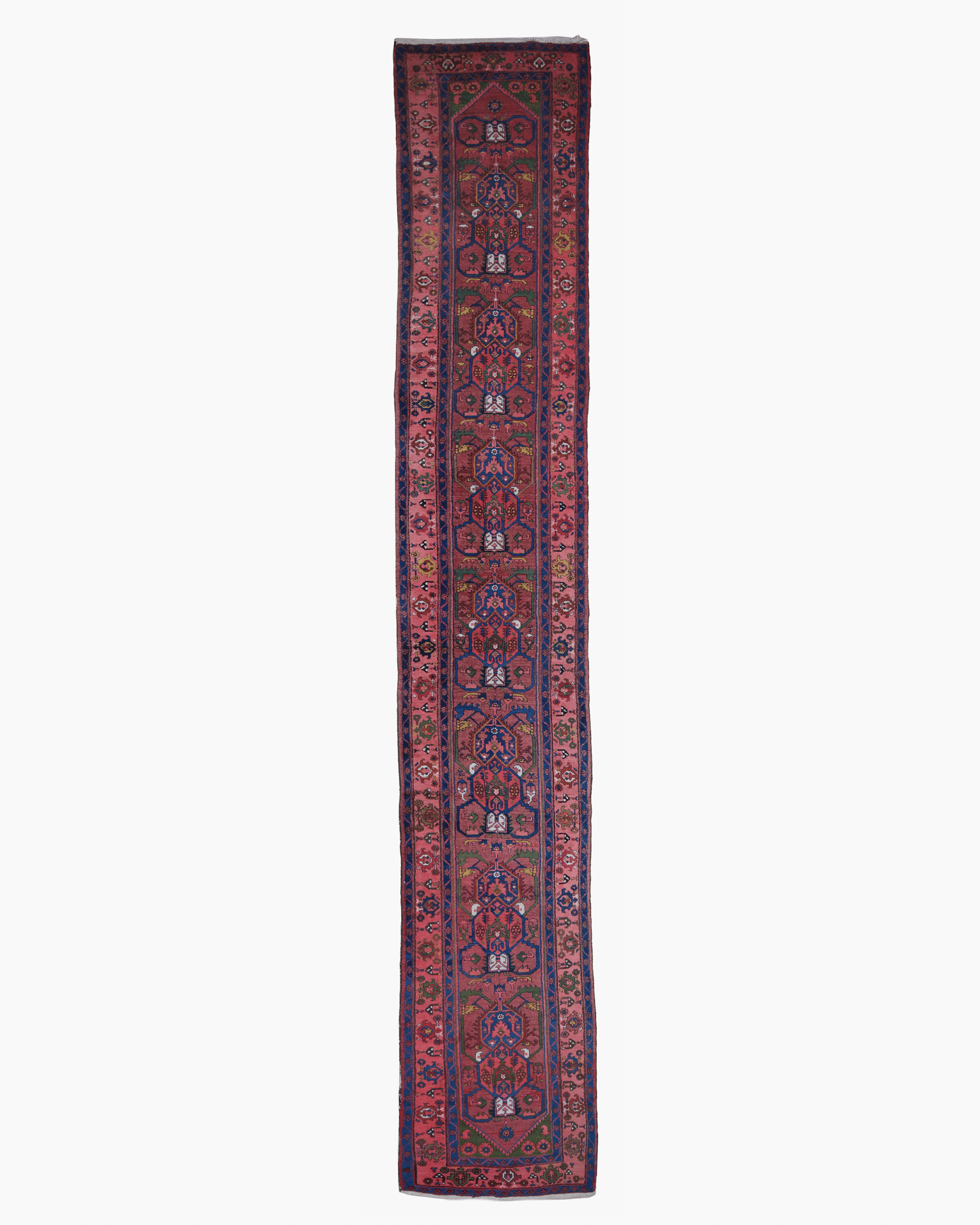 This 19th century Malayer runner is a remarkable example of the weaving artistry from the Hamadan region of Northwest Persia. Characterized by its elongated format and refined geometric detail, this piece showcases the exceptional skill of village weavers who successfully adapted sophisticated urban patterns into a more rustic and durable aesthetic.