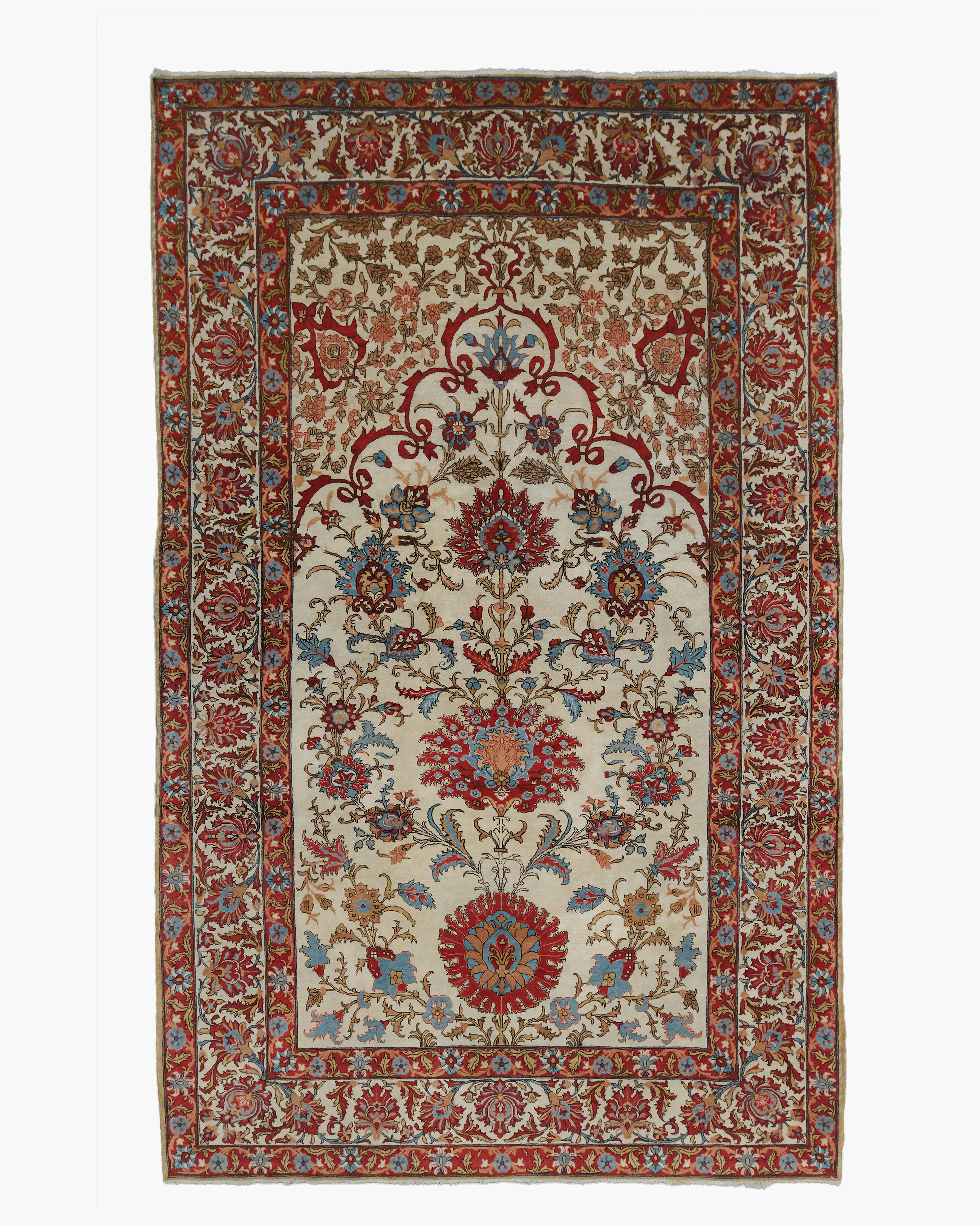 The color palette is masterfully balanced featuring a primary ivory ground that serves as a pristine canvas for the rich shifts of madder red, azure blue, and soft ochre within the floral motifs. These saturated yet sophisticated tones achieved through the expert application of natural dyes exhibit a chromatic depth and high-contrast clarity that are hallmarks of early Qum productions. The inclusion of a wide crimson-red primary border decorated with a rhythmic sequence of flowering rosettes creates a powerful visual frame that highlights the superior wool quality and high knot density of the Persian master weavers.