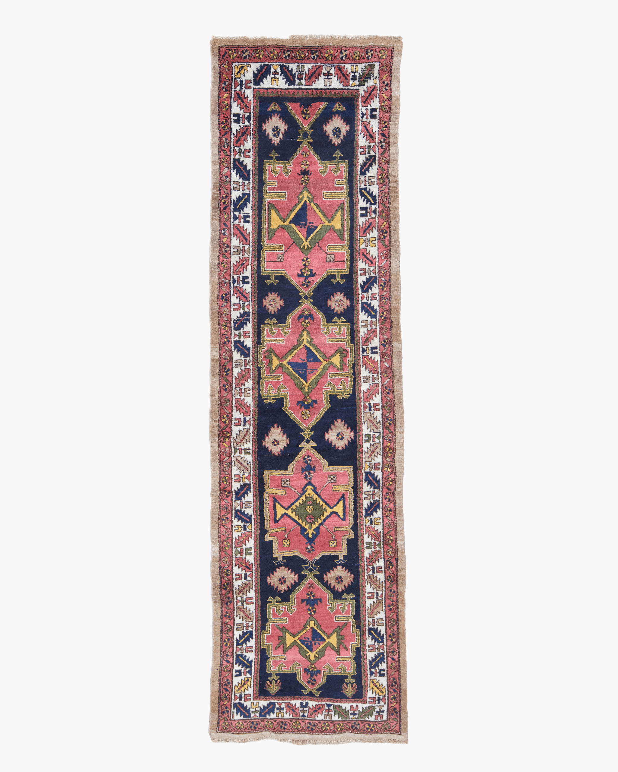 The design is organized around a vertical sequence of large, stepped geometric medallions aligned along a deep indigo field. These medallions, rendered primarily in soft coral red, ivory, and warm yellow tones, are characteristic of Sarab aesthetics and create a powerful sense of movement along the length of the runner. The strong linear symmetry and angular articulation reflect the nomadic and semi nomadic weaving traditions of the region.