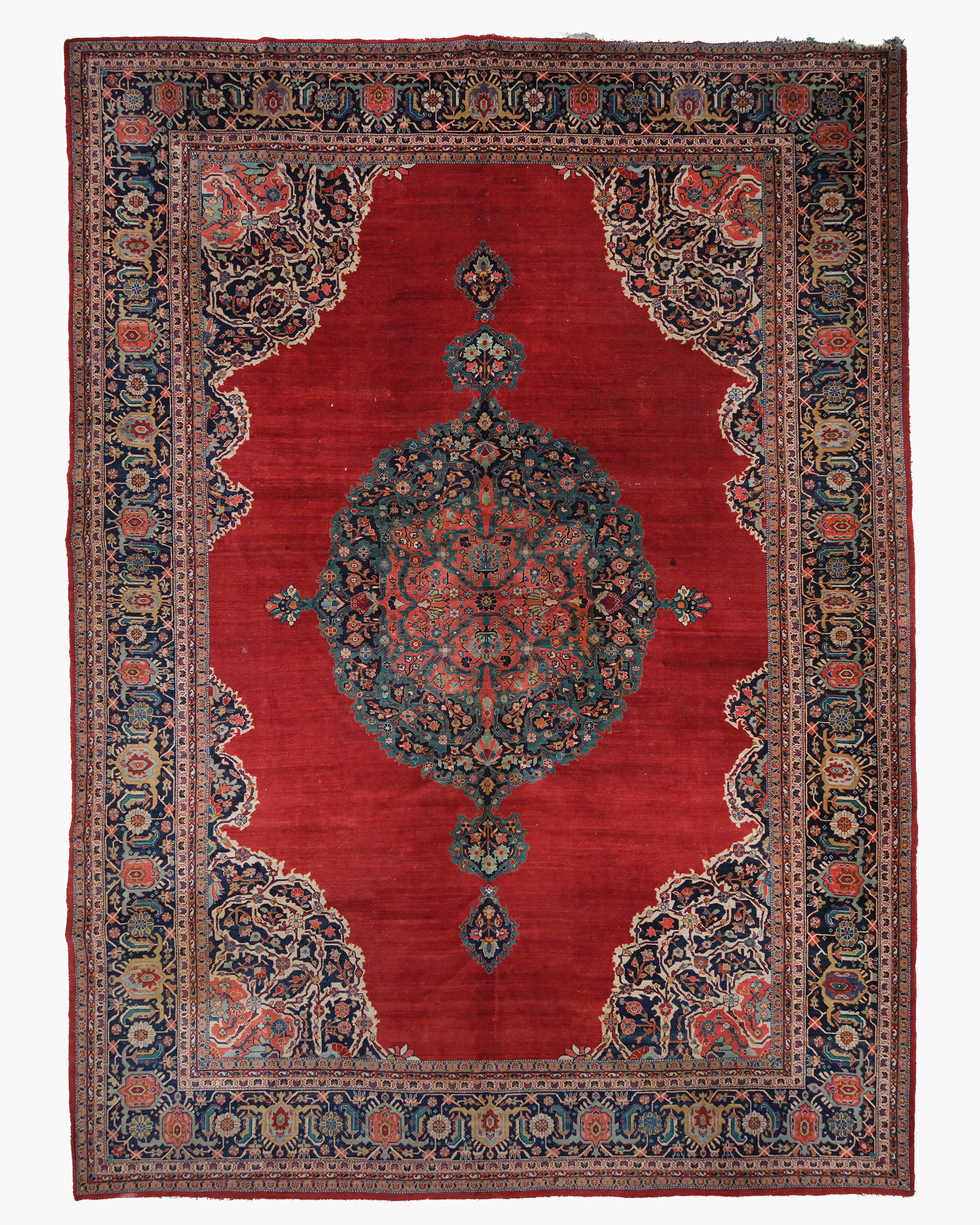 The color palette is masterfully balanced, featuring a rich and deeply saturated primary red ground that provides a dramatic backdrop for the deep indigo, soft ivory, and delicate teal accents. These saturated tones, achieved through the expert application of natural dyes nearly a century and a half ago, exhibit a chromatic depth and soft luminosity that have only become more refined over time. The sophisticated floral network within the borders and the central medallion showcases a masterful use of “shading” and detail that highlights the high-quality wool and technical finesse of the Sarouk master weavers.