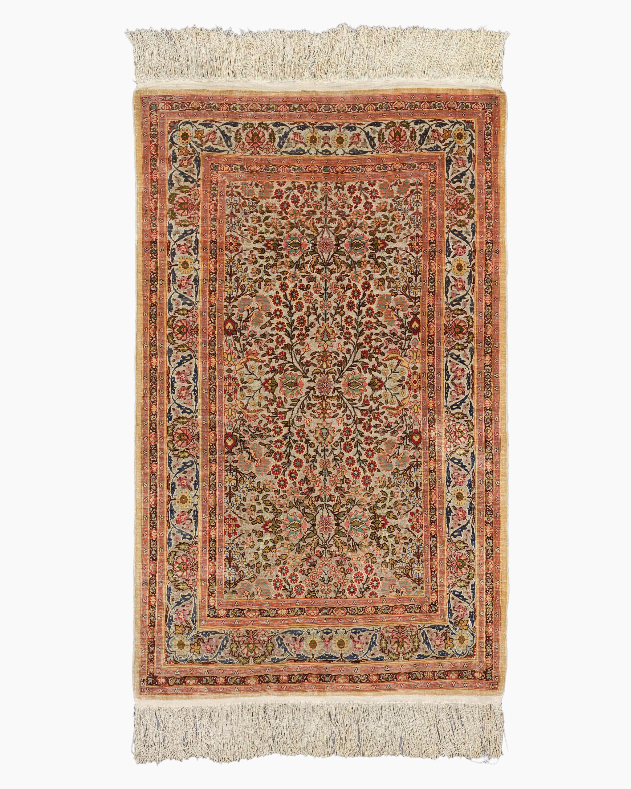 The color palette is masterfully balanced, featuring a primary taupe grey field that serves as a sophisticated canvas for high contrast shifts of rose madder, sage green, and sapphire blue. These rich and enduring tones, achieved through the use of premium silk threads, exhibit a luminous sheen and a saturated depth that are hallmarks of mid century Hereke productions. The inclusion of a formal, multi layered border system anchored by a primary border decorated with a rhythmic sequence of reciprocating floral rosettes and delicate scrolling “S” vines creates a precise visual frame that highlights the superior silk quality and the distinctive technical finesse of the master weavers.