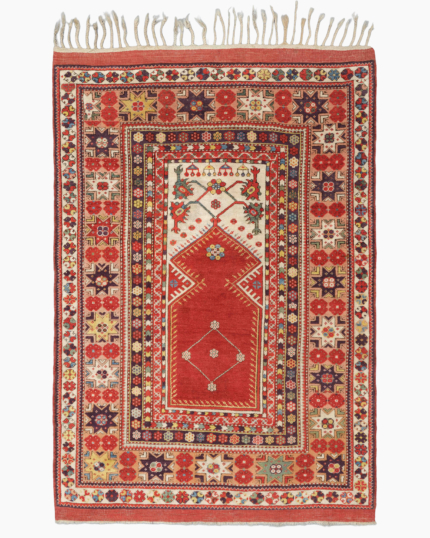 The design is organized around a large central lozenge shaped medallion, set within a rich madder red field. The medallion is articulated with stylized floral motifs and subtle angular details, creating a sense of symmetry and quiet monumentality. Smaller floral devices are evenly distributed throughout the field, lending rhythm and visual softness to the composition.