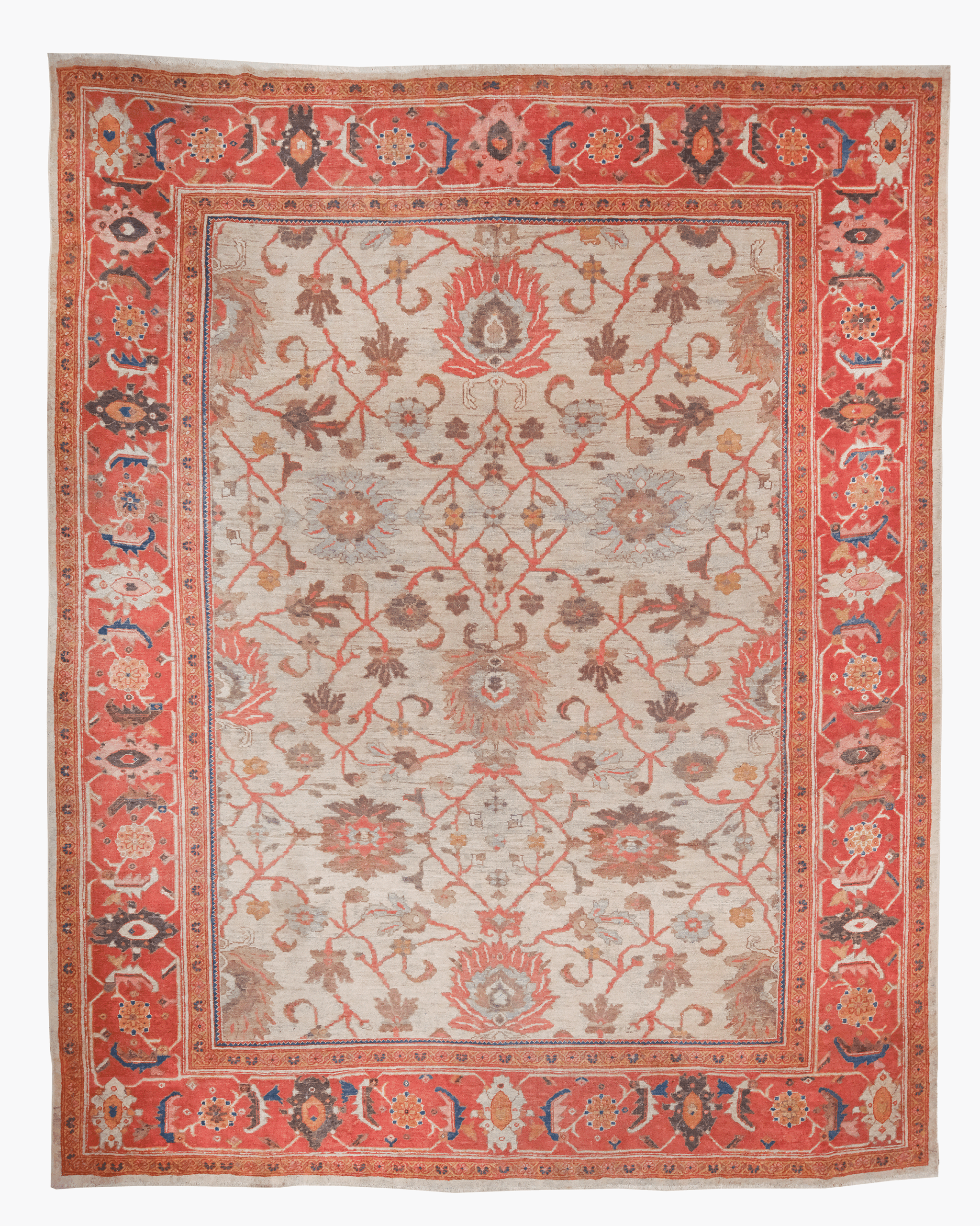 This magnificent piece features a restrained ivory field adorned with stylized palmettes, cloudbands, and arabesques in muted rose, camel, and soft indigo tones. The rich coral border provides the perfect frame—elegant yet commanding.