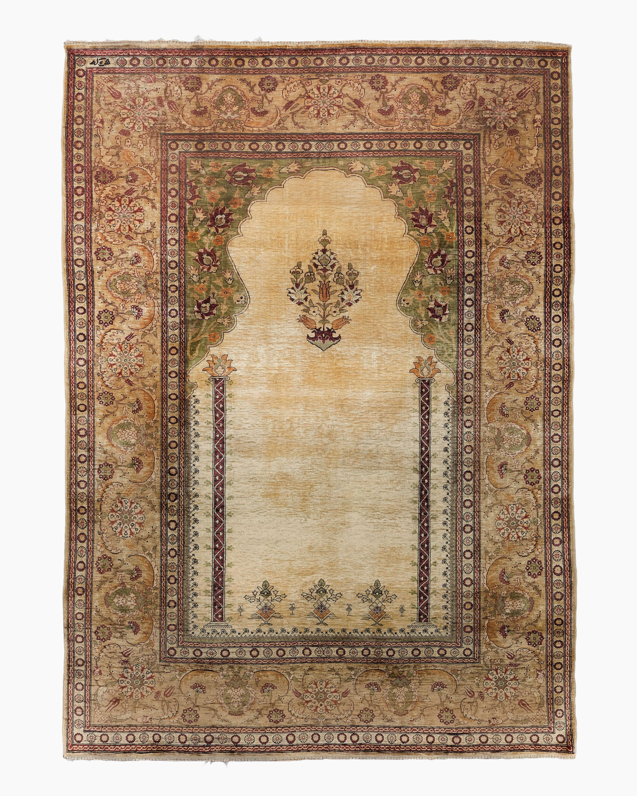 This elegant early 20th century Hereke rug is a refined example of Ottoman court weaving, distinguished by its architectural prayer rug composition and delicate classical ornamentation. Woven with exceptional craftsmanship, the piece reflects the high artistic standards and aesthetic discipline associated with the Hereke ateliers during the late Ottoman period.
