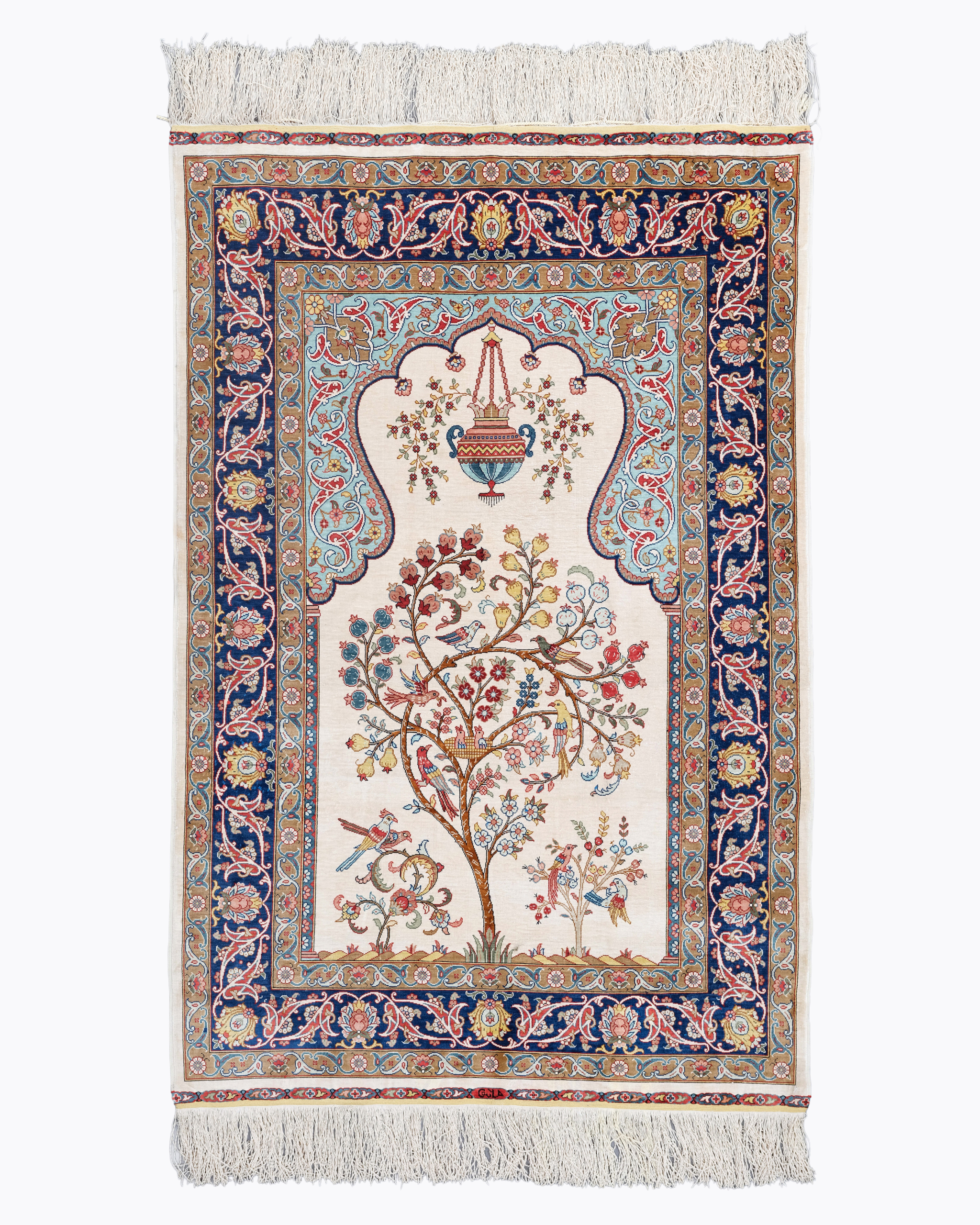 This rare mid 20th century Turkish Hereke silk prayer rug highlights a powerful and rhythmic pictorial composition featuring a vibrant “Tree of Life” motif populated with colorful exotic birds and blossoming pomegranates anchored within a luminous ivory field. This structural balance between the reaching botanical branches and the elegant mihrab arch decorated with a hanging mosque lamp reflects the pinnacle of the Hereke workshop tradition. Silk rugs of this caliber are world renowned for their extraordinary knot density which allows for the painterly execution of complex naturalistic themes and delicate curvilinear vines.