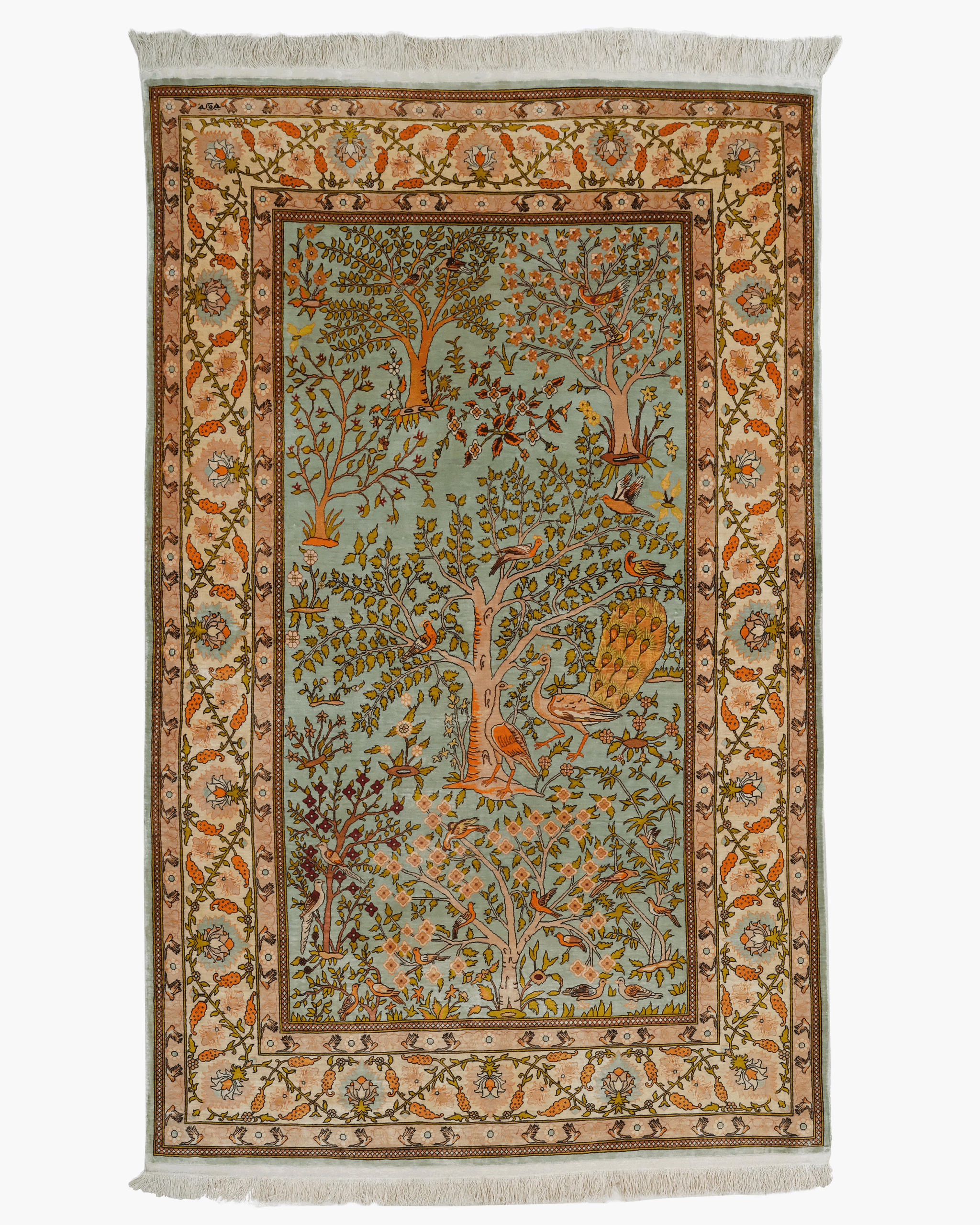 The composition features a sophisticated, all-over floral pattern set against a tranquil, sea-green ground. The design is densely populated with a variety of flowering trees, including blooming almond and cypress-like forms, as well as a lively array of exotic birds such as peacocks, pheasants, and songbirds. This intricate “Garden of Paradise” motif creates a sense of infinite movement and natural harmony, enhanced by the natural shimmering quality of the high-quality silk.