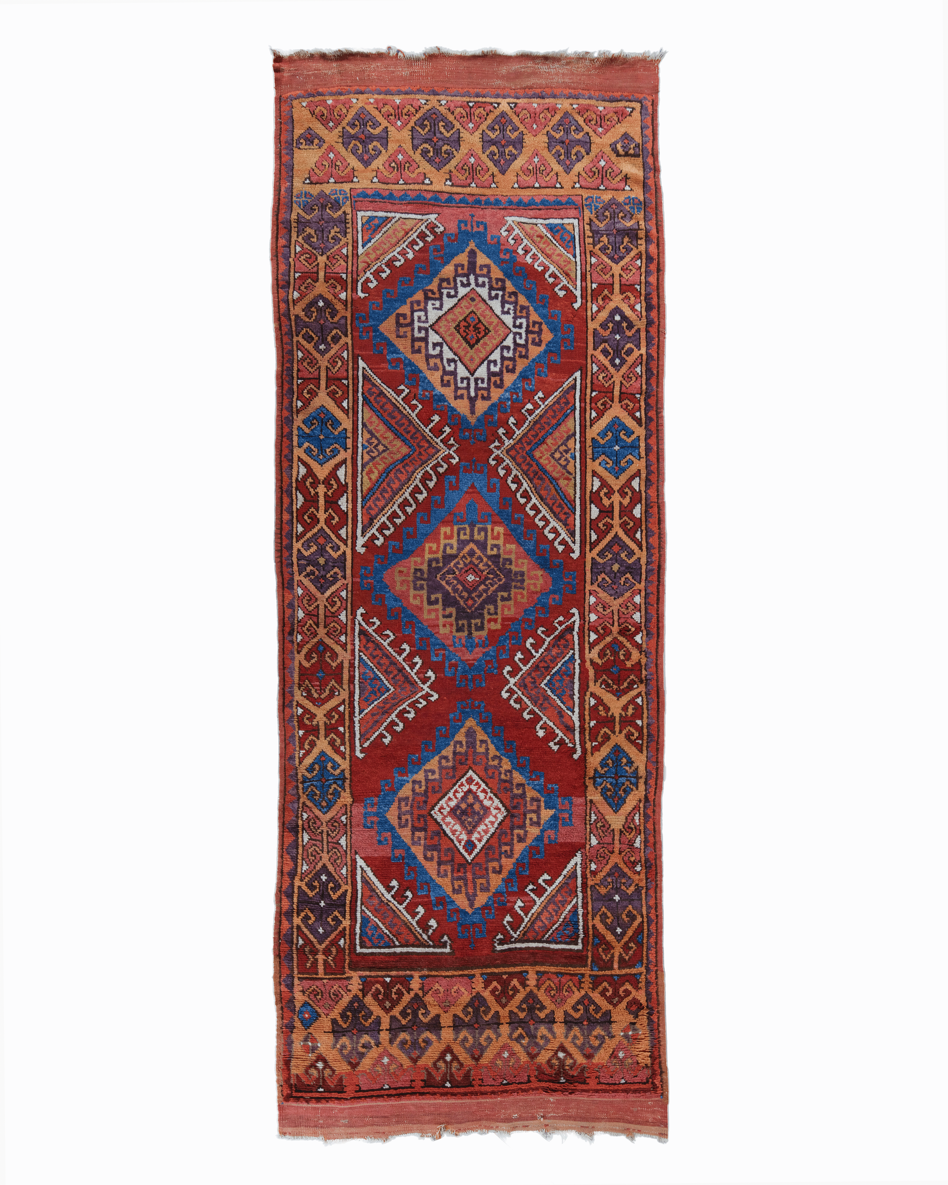 Structural analysis indicates the use of premium hand-spun local wool with a characteristically lustrous pile and a supple yet resilient handle. The exceptional clarity of the angular outlines—specifically the intricate internal serrated edges of the medallions and the precise geometric guard borders—and the presence of significant harmonious abrash within the red and blue sections definitively distinguish this antique masterpiece from later commercial examples. Ultimately this Urgup runner stands as a premier example of Anatolian tribal art representing a peak in both technical endurance and graphic majesty for global textile collectors.